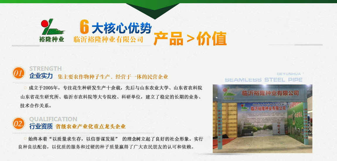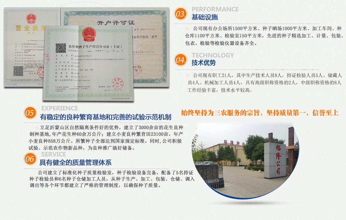 臨沂裕隆種業有限公司成立于2005年,是一家集主要農作物種子生產、經營于一體的民營企業。公司成立以來,立足當地優(yōu)越的土地、氣候、自然隔離等優(yōu)勢條件,以發(fā)展小麥、花生、蔬菜良種繁育為主,同時代理經營玉米、化肥等農作物良種及肥料。目前主要經營各類花生種子,小麥種子,玉米種子,蔬菜種子及專用復合肥料。